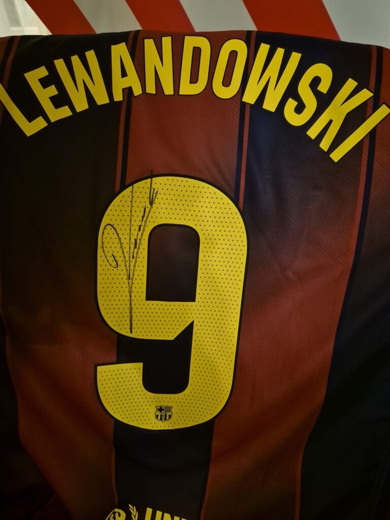 * podarowana przez Konsulat Generalny RP w Nowym Jorku koszulka klubu FC Barcelona z autografem Roberta Lewandowskiego, którą podpisał po historycznej ceremonii oświetlenia Empire State Building biało-czerwonymi barwami;