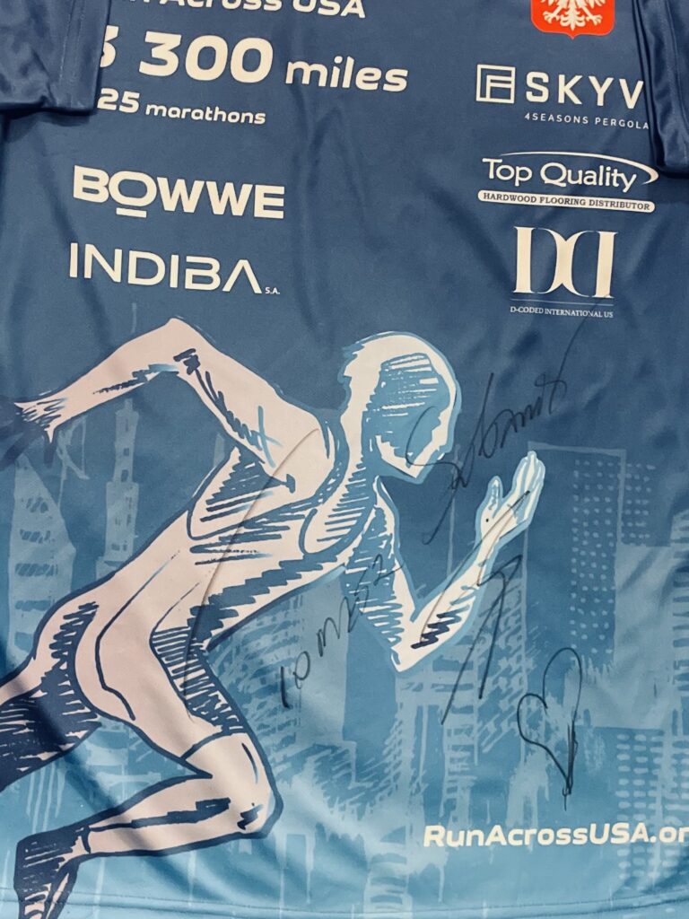 * koszulka z autografem „Polskiego Forresta Gumpa”, czyli biegacza ekstremalnego Tomasza Sobani, który na przełomie 2024/2025 przebiegł w ciągu 139 dni całe Stany Zjednoczone, a w tym roku w związku z 250-rocznicą powstania Ameryki zamierza przebiec 50 maratonów w 50 stanach USA. Koszulka jest podarowana na aukcję właśnie przez Tomasza Sobanię;