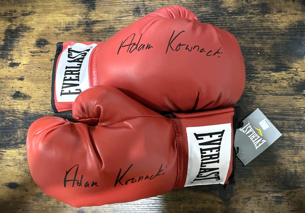 * rękawice bokserskie z autografem pięściarza wagi ciężkiej Adama Kownackiego podarowane przez Oskara Orenta;